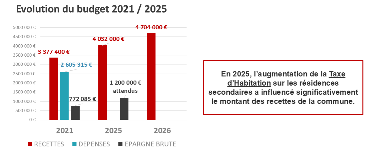Entre 2021 et 2025* (début et fin du mandat du maire sortant), le budget communal a connu une augmentation sensible des recettes. Cette progression s’explique en grande partie par l’augmentation de la taxe d’habitation sur les résidences secondaires, votée à l’unanimité en 2024 compte-tenu des investissements en cours.