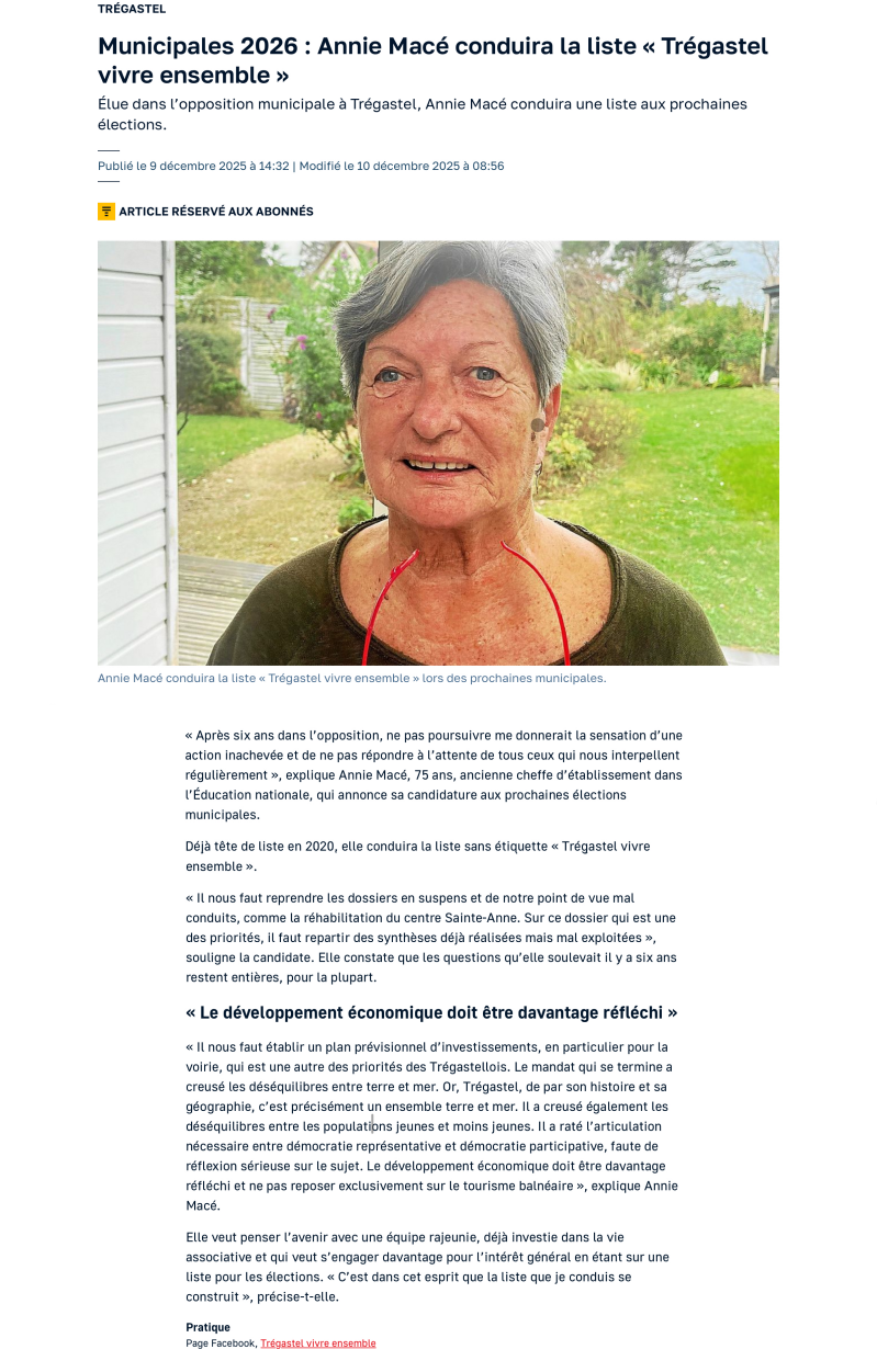 Ouest France 13/12/2026 : "Municipales 2026. Annie Macé conduira une liste pour « rééquilibrer » Trégastel"